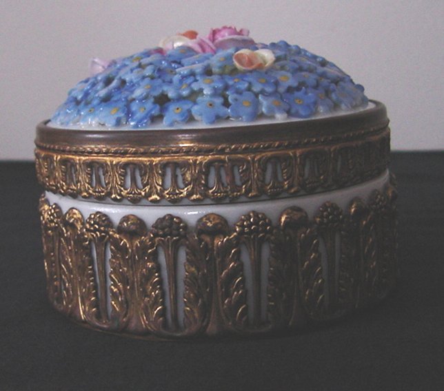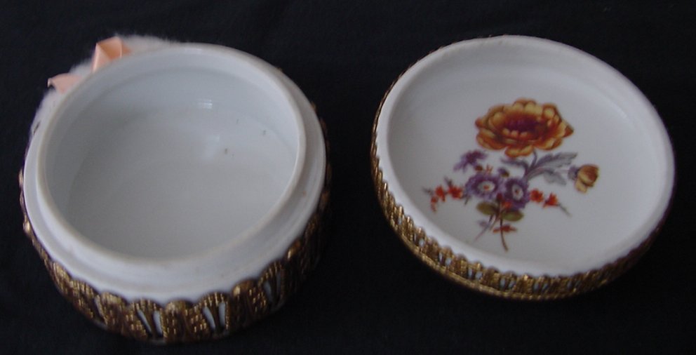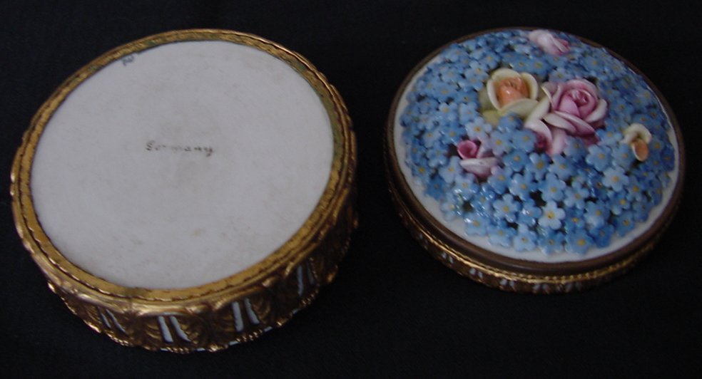 Elfinware Ormalu Covered Powder Jar with puff. Signed Germany on the bottom and another mark just visible close to the edge.The cluster of blue forget-me-nots is Schneeballen style (snowball) and the 3 tea roses are typical of Elfinware but there is no spinach. It measures 3 1/4" across and 2 3/4" tall. There appears to be a "70" blue under glaze on the rim of the cover. There are no missing flower petals or damage anywhere. A beautiful piece in excellent condition with the original powder puff...$225